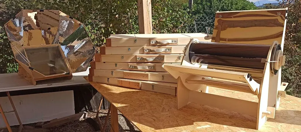 Le Comptoir du Soleil, c'est une micro-menuiserie, un atelier de transformation du bois, mais aussi des métaux tendres et du verre. Nous créons et fabriquons d’une façon artisanale des objets destinés à la transformation des aliments sans usage d’énergies fossiles, et sans électricité. Nous proposons ainsi un panel de cuiseurs solaires ainsi que de nombreux autres objets astucieux qui permettent de s’affranchir des énergies payantes et polluantes pour cuisiner, mais aussi préparer, conserver et présenter les aliments (garde-mangers, séchoirs, fumoirs, cuiseurs domestiques économes en bois, cuiseurs inertiels passifs, etc.).